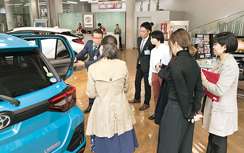 若年層の女性顧客獲得をめざし、課題車「ルーミー」をもとに車の装備やオプションを考えるコラボ企画を実施。店舗見学や企画プレゼンを重ね、学生が出した4つのアイデアが採用に。2020年11月に「サンテラス茨木」にて行われたイベント「梅トヨフェスタ」には、4つのアイデアを実現した車が登場。イベントには学生もスタッフとして参加した。