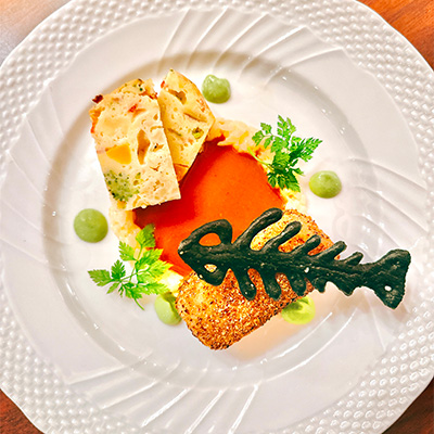 メニュー「未来の子供達へ海の幸のクリームコロッケと野菜いっぱいのケークサレ」