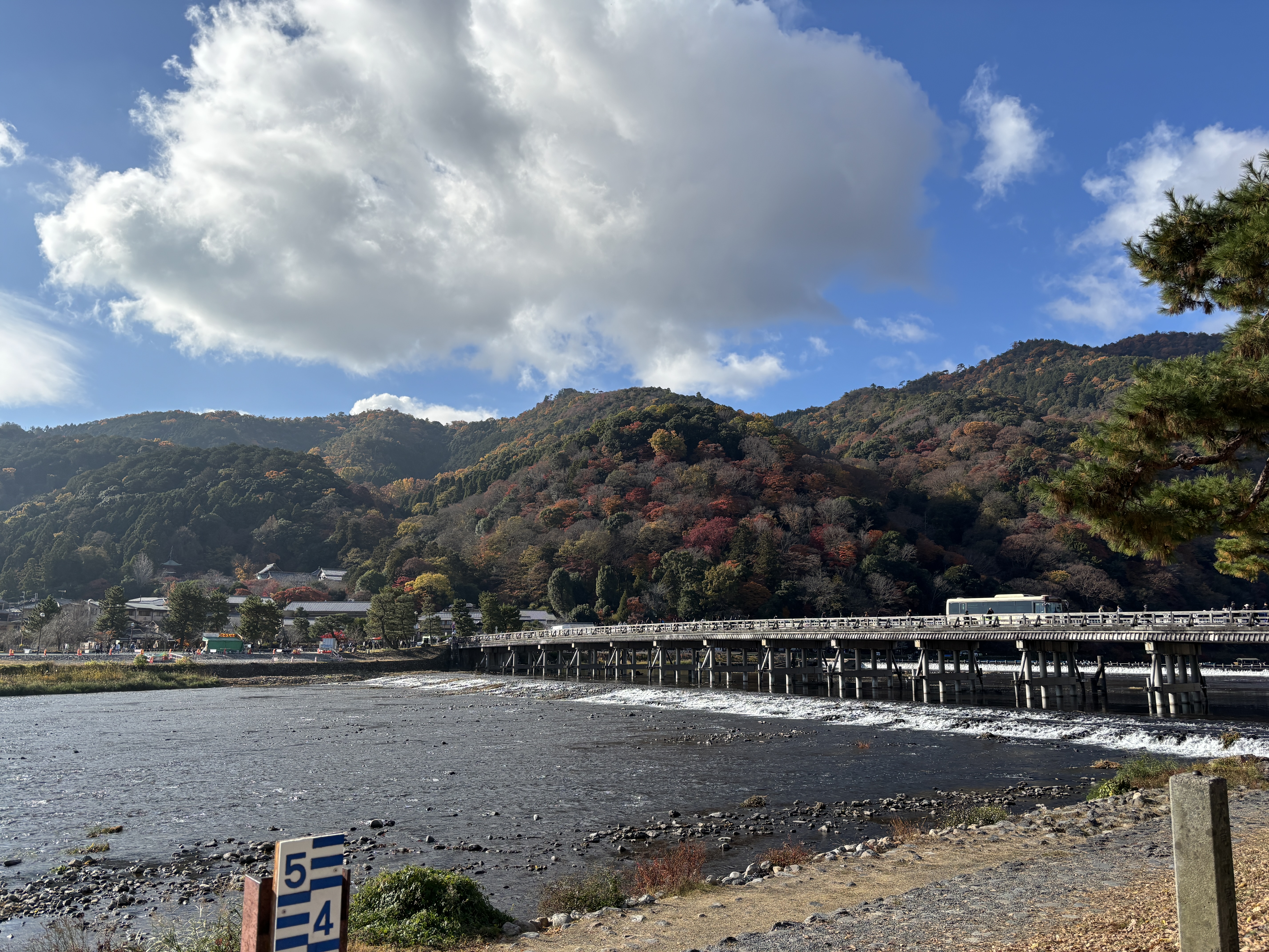 阪急嵐山駅を出発し、渡月橋を越えて上村先生の散歩コースである山道を少し登ると、とても美しい紅葉の景色が広がっていました。